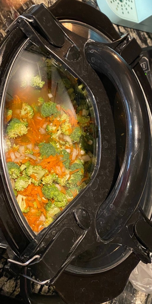 Combine broccoli, onion, carrots, chicken stock, salt, pepper, and nutmeg in the slow cooker and cook on low for 4 hours.
